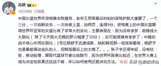 mk体育-女篮险胜捷克引热议!苏群:张子宇与现代篮球脱轨 很难再有李梦了